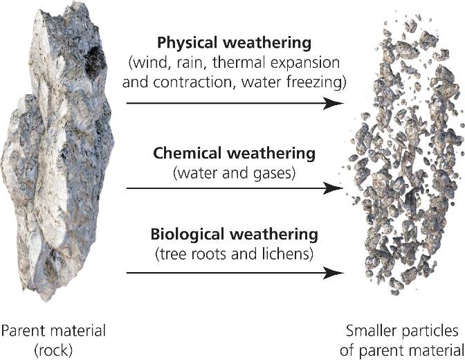 Weathering of parent material (rock) erodes chunks of minerals.