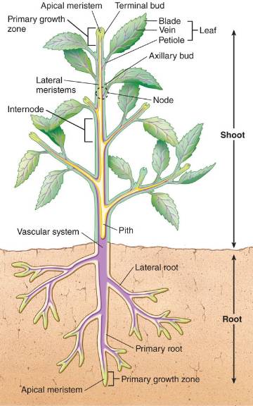 Apical meristems are located at the tips of roots (below ground) and shoots (above ground), promoting their elongation, a process called primary growth.
