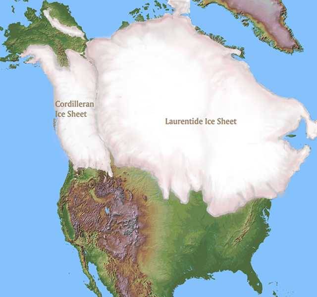 Two vast ice sheets extended over much of the North American continent, with an ice-free corridor in between.