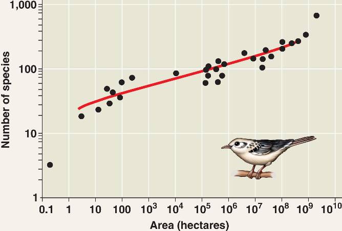 In general, a larger geographic area has more species, as shown in this graph of North American breeding birds, plotted on a logarithmic scale.
